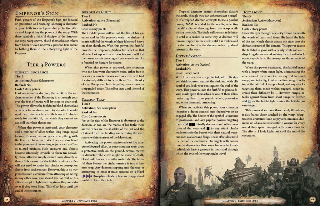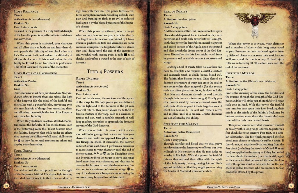 These are ported over quite directly from Dark Heresy 1e’s Blood of Martyrs expansion as I thought they fit in as talents pretty well, no need to over-complicate things. They always have a Story Point cost attached, but Sororitas characters can reduce the cost for a Faith Power by 1 once per session, which means they can effectively manifest one of the less potent powers for free.