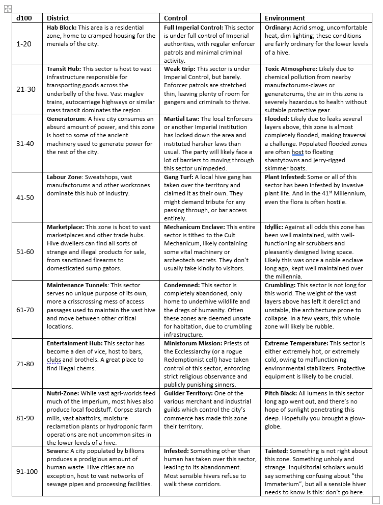 I also made this little table on a whim; a quick way to generate areas in the lower areas of a hive, for if you need some random encounter ideas when the party wander off the beaten path or get lost.